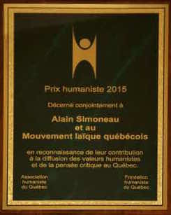 La Fondation humaniste du Québec (FHQ) et l'Association humaniste du Québec (AHQ) attribuent le Prix humaniste 2015 à Alain Simoneau et au Mouvement laïque québécois.